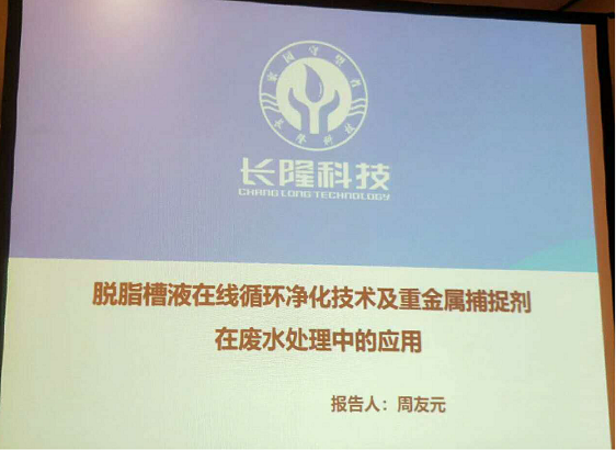 長隆科技的匯報主題是“脫脂槽液在線循環凈化技術及重金屬捕捉劑在廢水處理中的應用”。